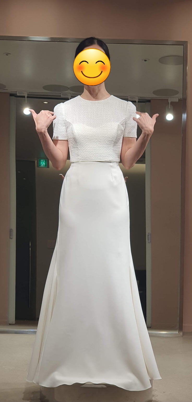 이렇게 말씀드리니, 매니저님이 신부님 스타일일 거 같았다고 웃으시더라. 하얀색 슬림 드레스인데, 상체 쪽은 트위드 소재 반팔이고, 약간 높이 잡힌 허리선부터 아래쪽 치마는 약간 탄탄한 느낌의 쉬폰 소재다. 과하지 않고 단정하고 단아한 느낌! 검색했을 때는 못봤던 드레스였다.