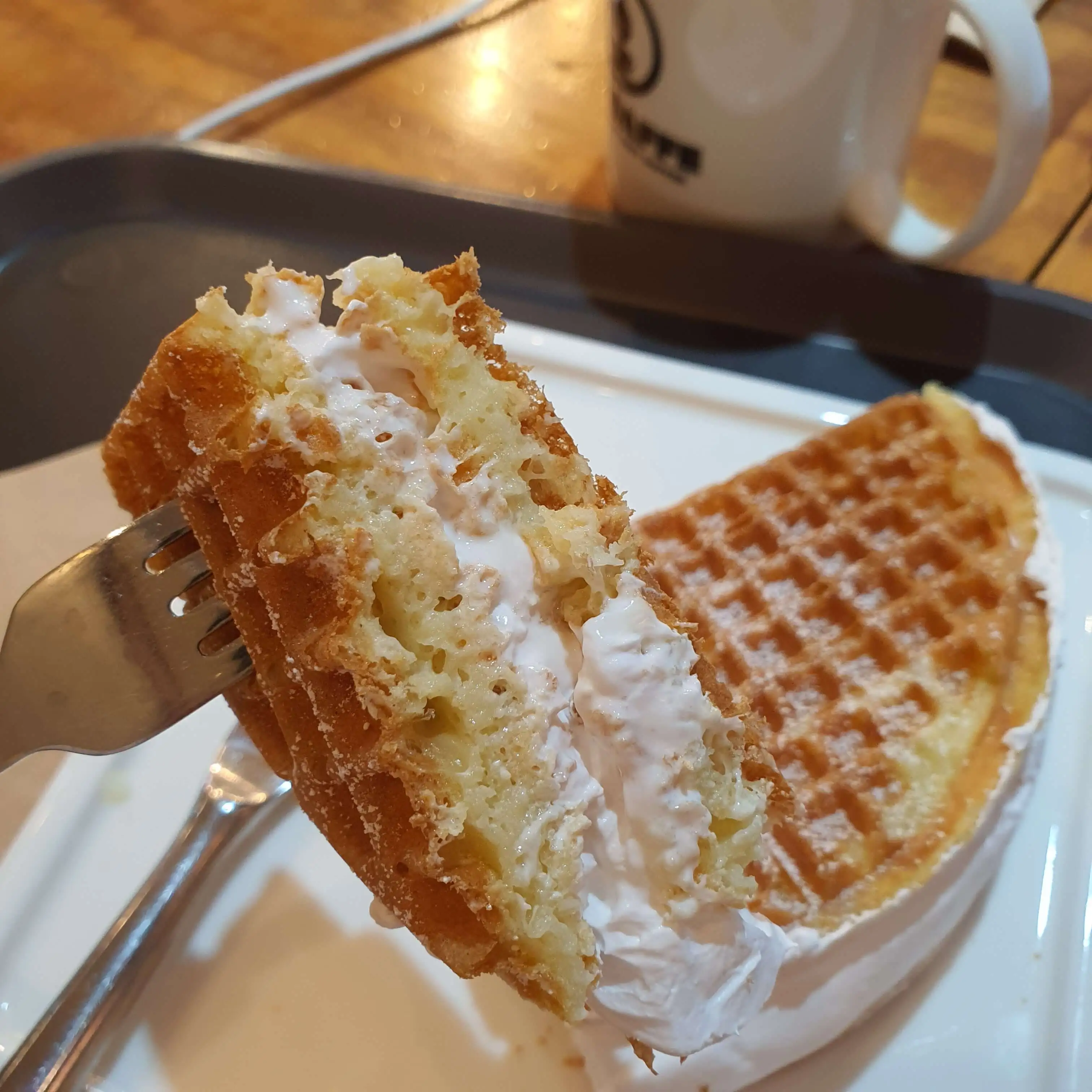 찾아가기 전에 잠깐 검색했는데 시크릿라떼랑 와플이 맛있다는 후기를 봤다. 들어가서 보니 다른 디저트도 먹음직해 보였지만, 역시나 와플이 대표 메뉴 같아서 이걸 시켰다. 10분 후쯤 막 만들어진 와플을 받았다. 그리고 입으로 가기 전에 눈부터 즐거워지더라! 생크림이 빵빵히 들어있는 영롱한 와플의 자태!