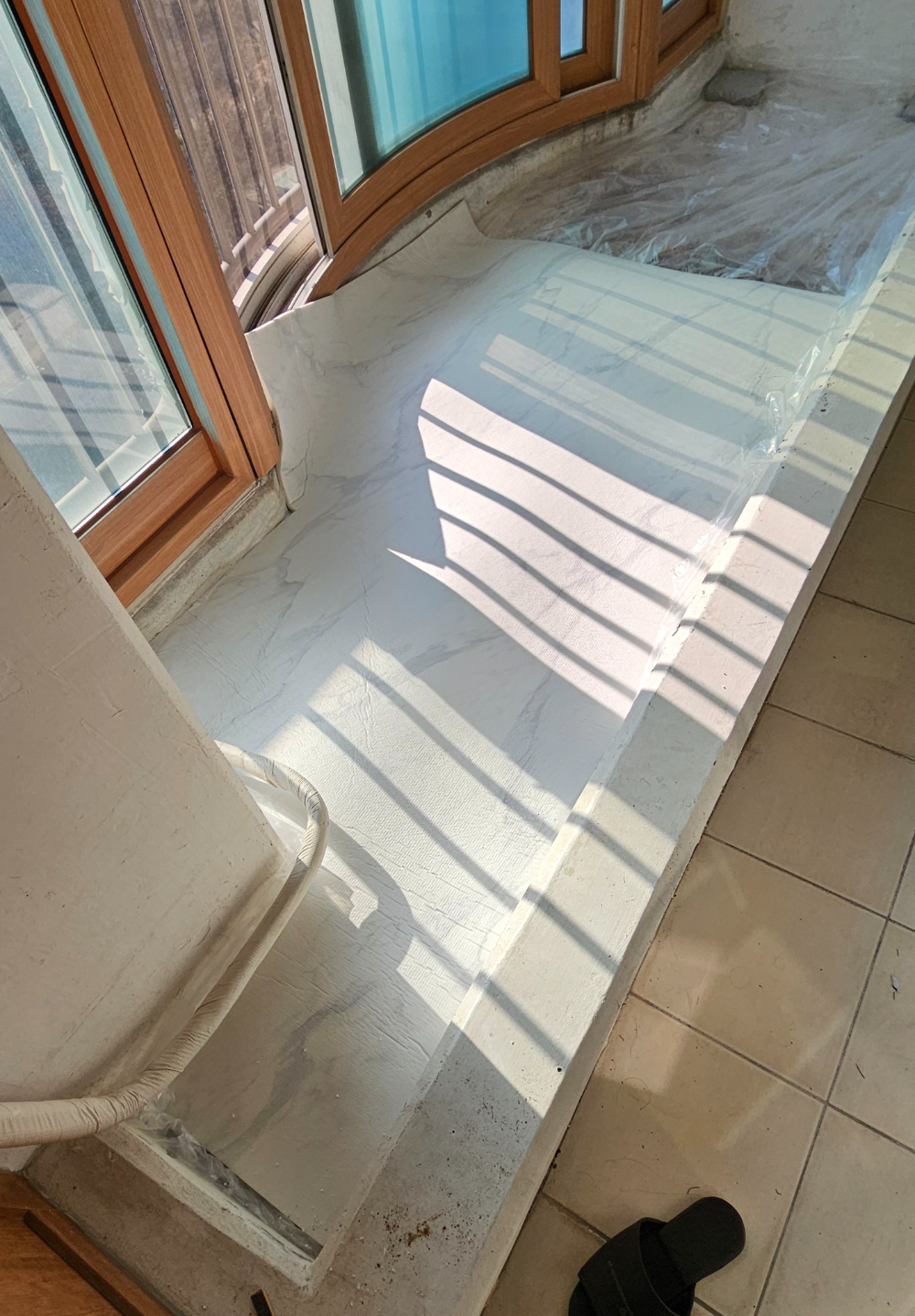 크기가 매트 하나로는 부족해서 두 개를 썼다. 먼저 왼쪽부터 각진 부분을 잘라서 맞춰 덮고, 둥근 부분은 아래 사진 같이 먼저 덮고 나서 잘랐다. 매트는 칼로 잘 잘린다.