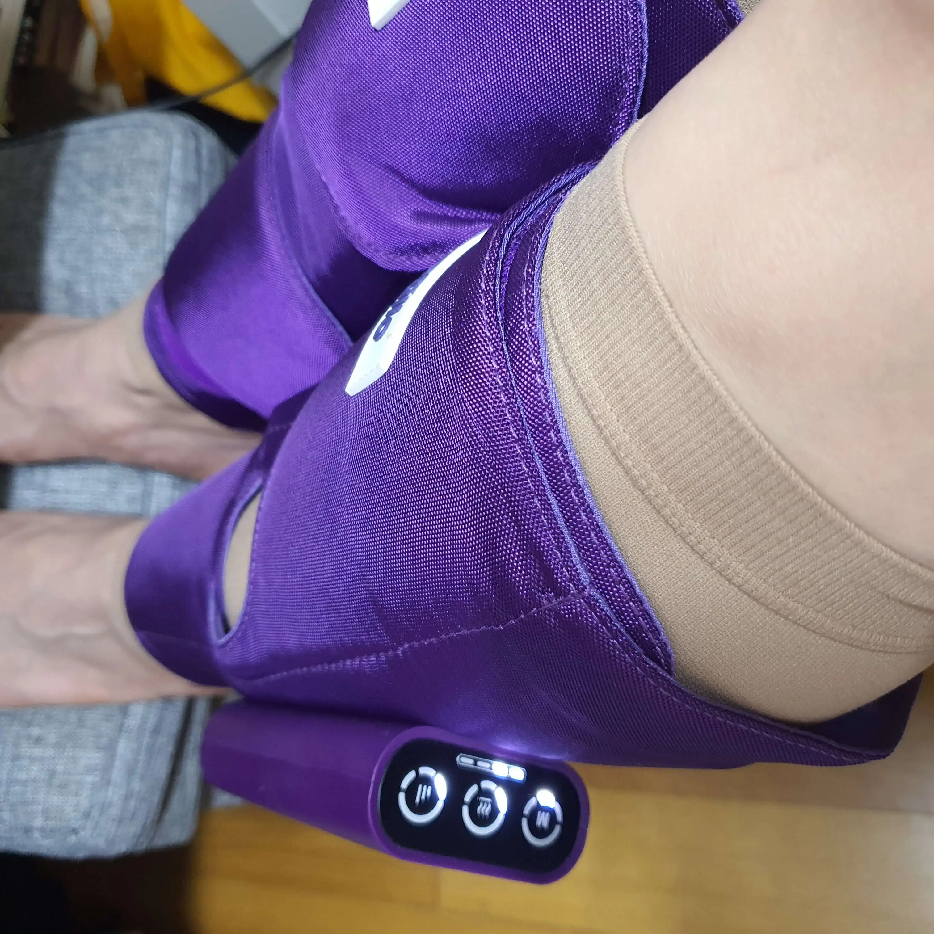 주무름 기능 말고 따뜻하게 해주는 온열 기능도 있는데, 이걸 사용시 저온화상에 주의하라는 안내 문구가 있다. 그래서 나는 맨살에 안 하고 종아리 압박 스타킹을 신은 후 풀리오를 착용했다. 마사지는 2단계, 온열 기능은 1단계로 놓고 쓰는데 따땃하고 아주 좋다.