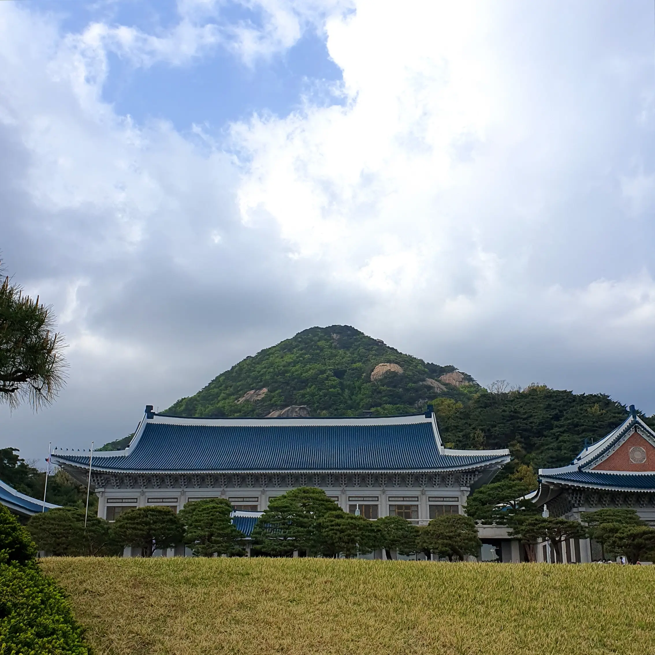 본관 나와서는 벤치에 한참 앉아 쉬었다. 인왕산을 등진 청와대 본관이 딱 보이는 자리라서, 앉아 있노라니 앞쪽에서 사람들이 나름의 포즈로 사진을 찍는 걸 바로 구경할 수 있었다. 이 밑에 사진이 청와대 시그니처 샷 느낌이다. (구도가 별로 좋진 않다만..) 이걸 배경으로 다들 한컷 남기더군.